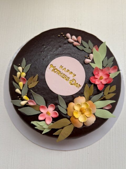 Perfect Chocolate Cake covered in chocolate ganache and decorated with hand made sugar flowers and leaves