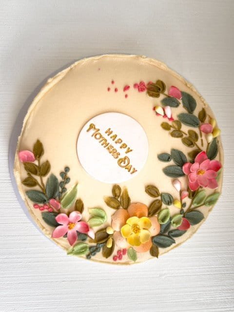 Chocolate cake covered in butter icing and decorated with hand made sugar flowers and leaves
