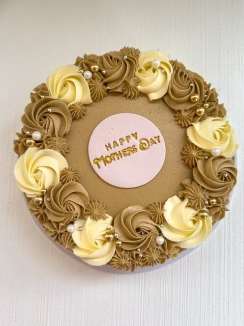 Coffee Cake covered in coffee buttercream frosting and decorated with rosettes